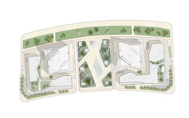 Le due torri (The Greenland Towers) chiudono un’asse urbano che, dalla nuova stazione ferroviaria, conduce al centro della città. I grattacieli formano quindi una porta d’ingresso a Zhengzhou: un contrappeso verticale all’edificio orizzontale della stazione ferroviaria. La grande piazza antistante i due edifici è l’elemento di collegamento tra queste due nuove, importanti funzioni.
