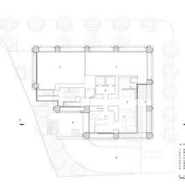 Tendenzialmente quadrata, in un angolo del lotto – per rispondere ai regolamenti edilizi – la pianta arretra due volte così che dalla strada l’edificio appare come tre volumi giustapposti.