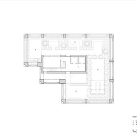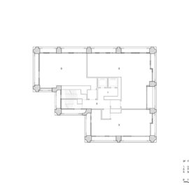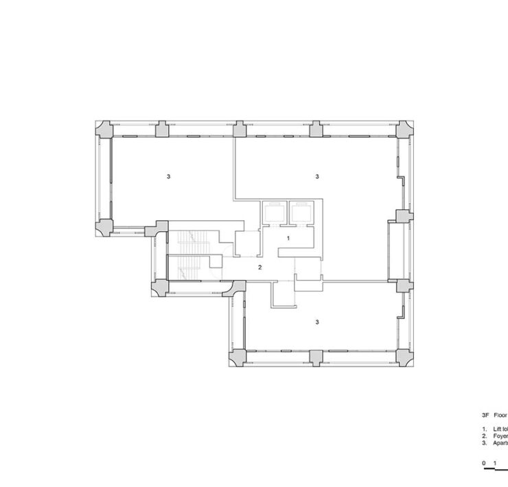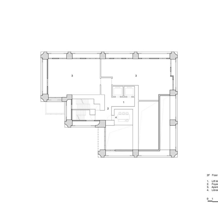 Il progetto degli interni riflette la ricerca dello studio di forme archetipiche e di ricchezza di materiali. L’atrio di ingresso a doppia altezza è rivestito in un terrazzo di colore grigio caldo, al pari delle parti comuni che conducono all’ascensore e all’area lounge.