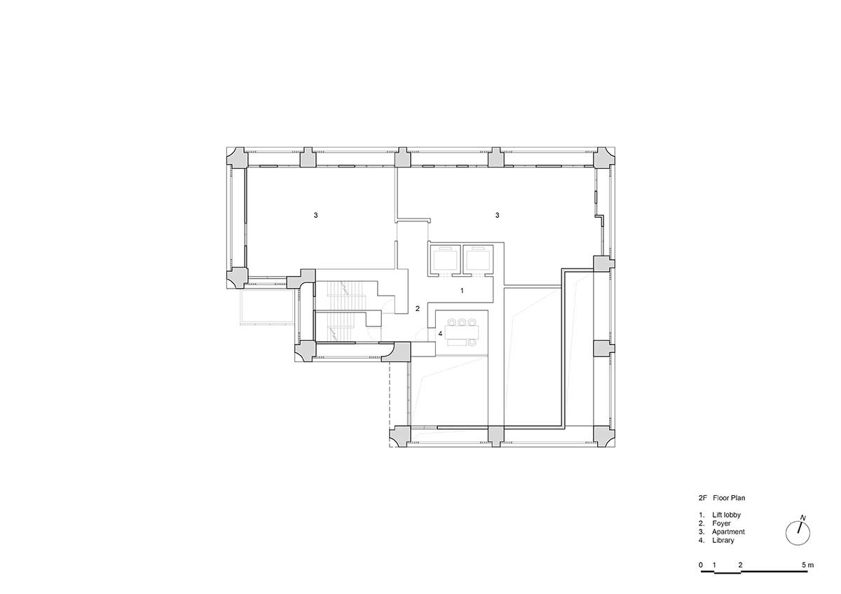 Dal livello superiore una piccola biblioteca, con un arco che richiama i portici degli edifici storici di Shilin, si affaccia su questo spazio.