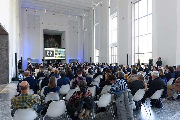 | Il pubblico nel salone d´Onore della Triennale di Milano per il convegno Zintek al Davines Village: forma e materia in architettura |